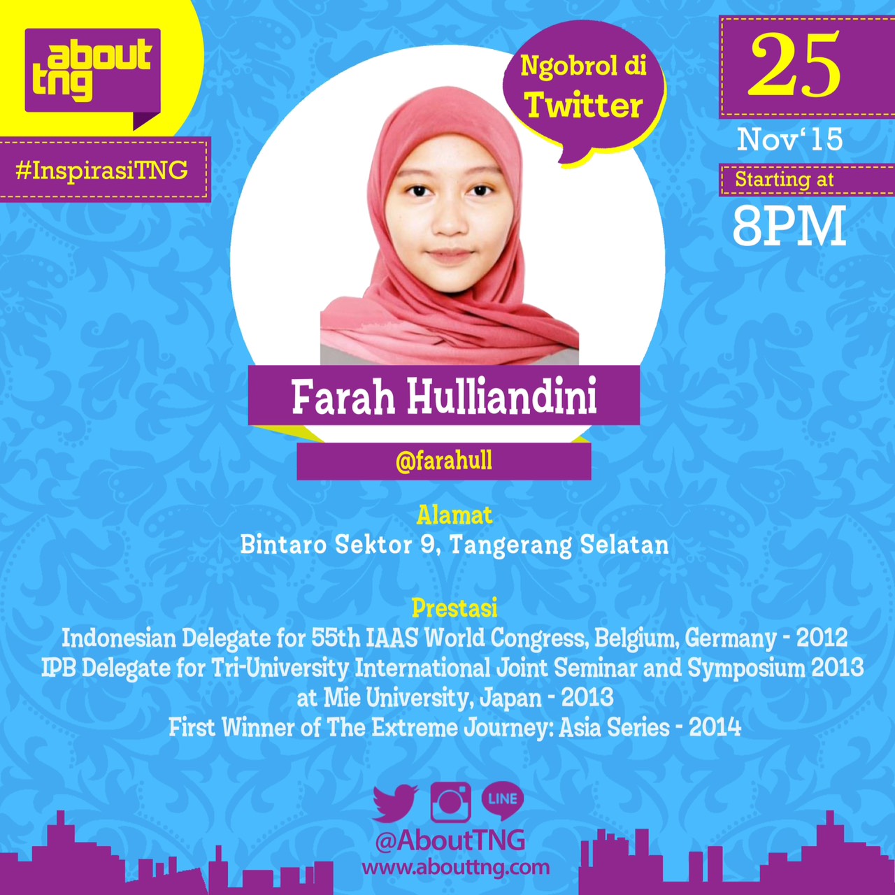 Hmm, sederet pengalaman dan prestasi Farah sepertinya tak cukup untuk disebutkan disini, TNGers! TNGers yang ingin tahu lebih jauh cerita dari wanita berhijab ini, pantau kembali obrolan inspiratif di Ngobrol di Twitter @AboutTNG with @farahull pada program #InspirasiTNG pada Rabu, 25 November 2015 mulai pukul 20.00 WIB. Only on Twitter @AboutTNG!